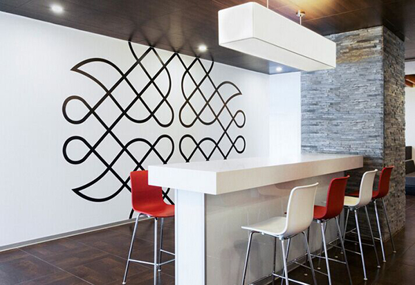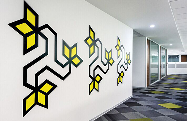有這樣的一個公司,他們在辦公室裝修時,辦公室設計師由于受到當地的民間文化的影響,從中得到靈感,他們設計的圖案具有很強的民族風色彩,他們將其與辦公室裝修相結合,有機地將其與建筑設計相融合了,展示出來的則是一番獨特的視覺效果體驗,被放大的圖形與圖案和背景墻形成非常鮮明的對比,他們做了非常多的關于這方面的主題墻,這個公司以標新立異的風格作為思維導向,同時也把公司形象與品牌價值,通過色彩的添加,使現代化的空間與傳統文化實現無縫對接。